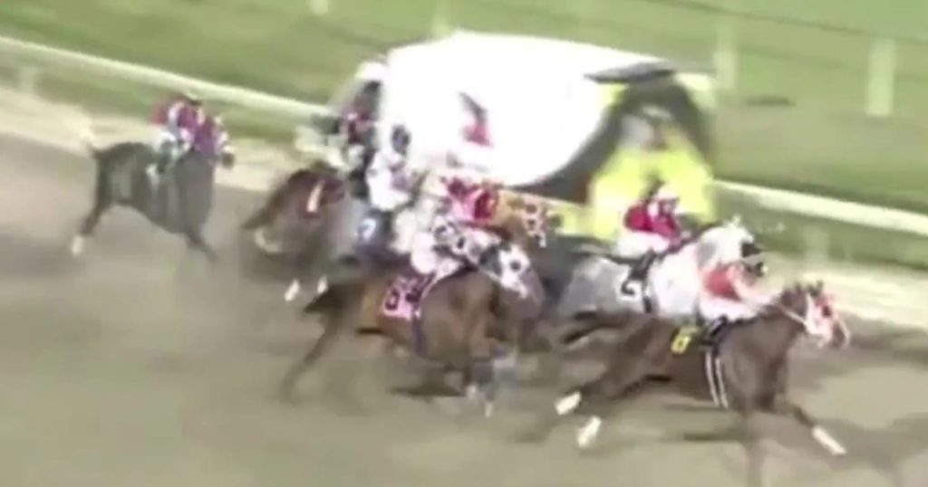 Videos of the incident have spread like wildfire within the horse-racing community and beyond, with spectators left open-mouthed at the chaos that was somehow averted on the one-mile oval track in St Landry Parish, Louisiana.
